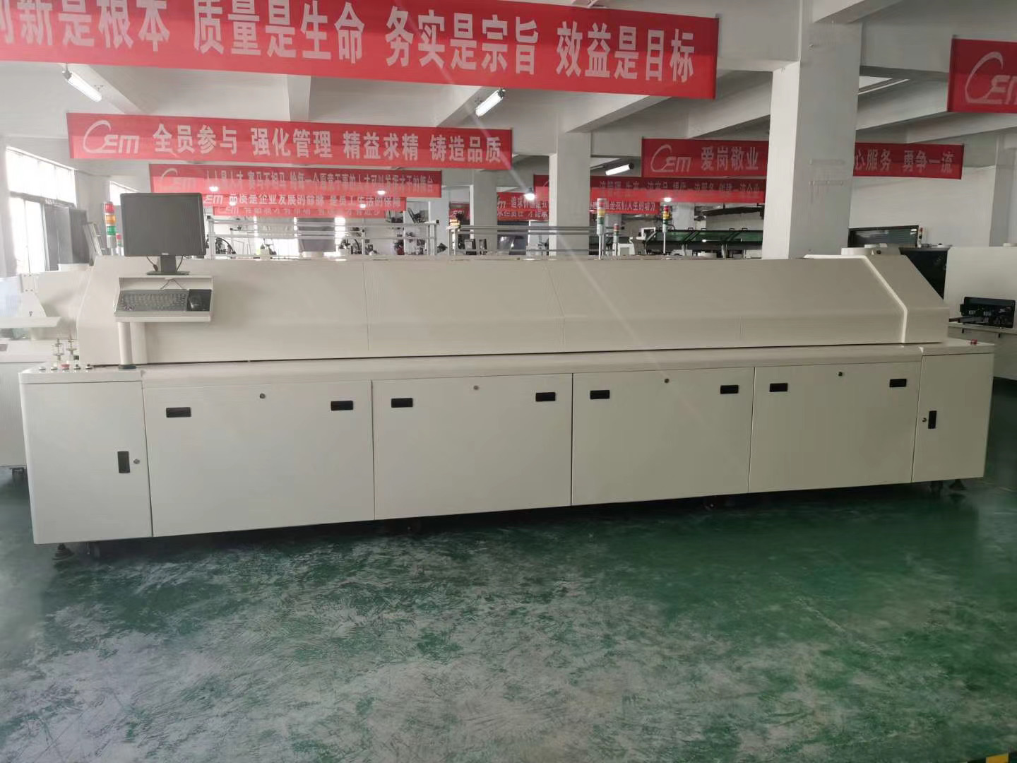 大型八溫區回流焊機用來回流焊接精密貼片元件,比如CSP、BGA、0201CHIP等電器元件的焊接。大型八溫區回流焊機正常運行功率是11KW,啟動功率是75KW。大型八溫區回流焊機相比起來還是比較耗電的,如果所焊接產品批量不大,元器件不是太精密,建議還是用中型八溫區回流焊機。