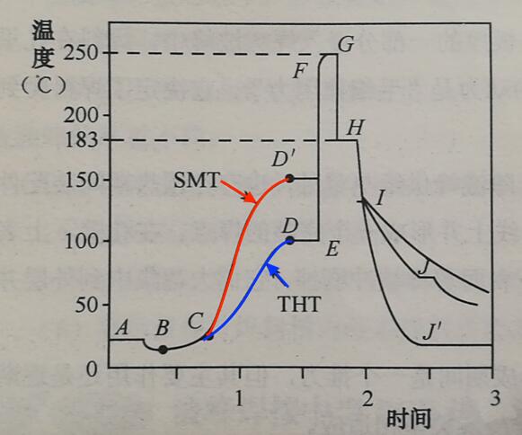 當焊接操作開始,操作者將室溫PCBA通過助焊劑涂覆區時,印制板的溫度接近于助焊劑的液溫,即圖中B點。涂覆了助焊劑的PCB從C點開始進入預熱區,受熱后助焊劑中的溶劑不斷被蒸發,而助焊劑中的固體成分開始分解出能凈化基體金屬的活性物質,在PCB到達D點時,達到預熱所要求的溫度,這是一般的通孔安裝PCBA預熱溫度曲線。對于 SMC/SMD的大量應用的PCBA,由于PCB基板材質、厚度、層數、銅箔黏合劑等因素,決定其熱容量的提高,預熱溫度也隨之提高。預熱溫度被普遍提高到與焊接溫度的差值小于100℃以內的程度,如圖中紅色曲線所示的D'點(150℃左右)。