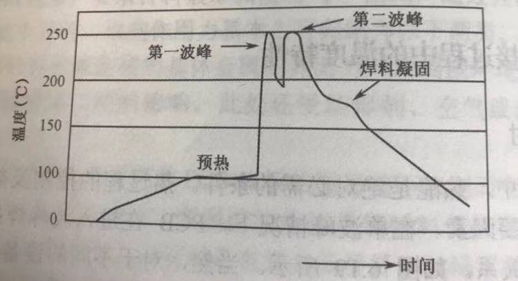 單波峰焊接時,在波峰焊接過程中,熱能是絕對必需的條件,熱過程的控制及熱能的有效利用,是確保波峰焊接效果的重要因素。在單波峰情況下,PCB在進入波峰焊接設備系統后焊接面上的溫度隨時間的變化關系,當然,對于不同的設備系統,該曲線會稍有不同,但總的規律是大同小異的。