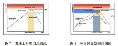 焊膏常用的爐溫曲線分為直線上升型(或三角型,如圖 7 所示)與平臺保溫型(如圖 8 所示)