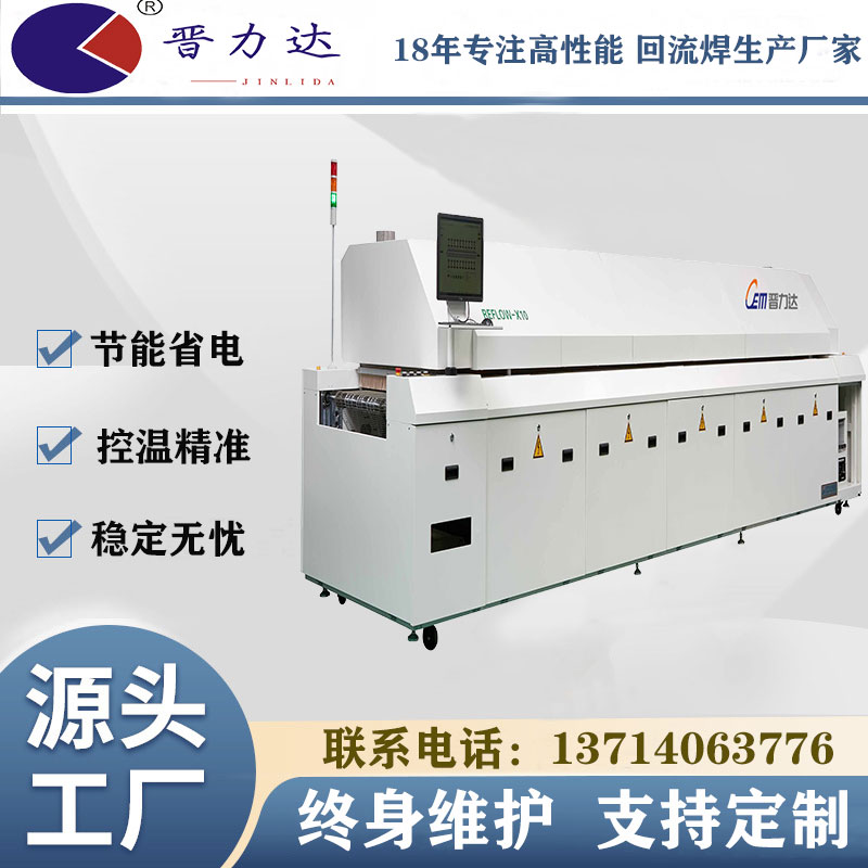 通常電子廠常常錯誤地認(rèn)為只有購買一個更大的回流焊機(jī)才能滿足他們的需求,但事實上這樣做往往是不劃算的,還會浪費(fèi)占地空間。在大批量生產(chǎn)環(huán)境中,選擇810個溫區(qū)的回流焊機(jī)和更快的皮帶速度可能是一個解決方案。然而,具體選擇還需要根據(jù)電子廠的實際需求來考慮。如果是產(chǎn)量大SMT貼片加工,比較適合選大型回流焊機(jī),產(chǎn)量小,那就不適合了,因為這樣會造成資源浪費(fèi)。晉力 達(dá)回流焊機(jī)在這方面有一些具體的經(jīng)驗,接下來我將與大家分享一下。