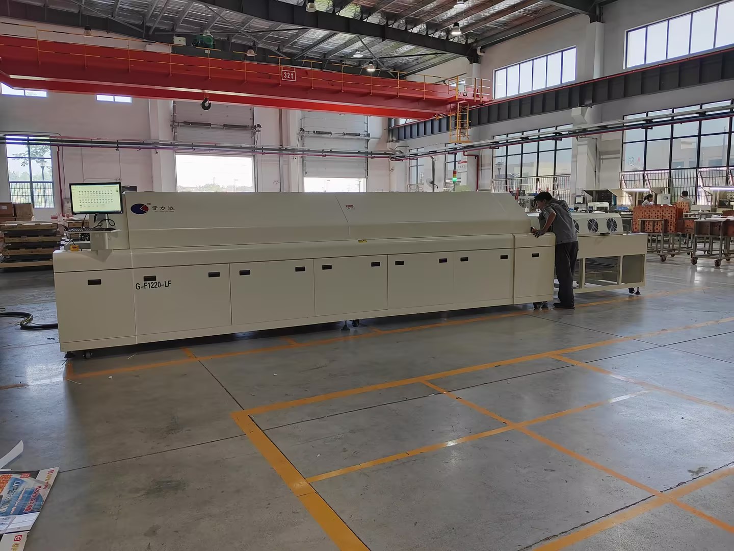 北京維通利電氣有限公司分公司株洲維通利電氣有限公司在2023年8月7號 采購我司晉力達大型環保全熱風全電腦 控制12溫區回流焊G-F1220-LF 全熱風/網帶+電腦+6段冷卻900MM寬網帶,網帶以上內空高度100MM,方向左進右出,加通過式全自動清洗機(兩段泵浦噴淋+風機 風刀+熱風烘干,網帶寬900MM,用于疊層母排回流焊。